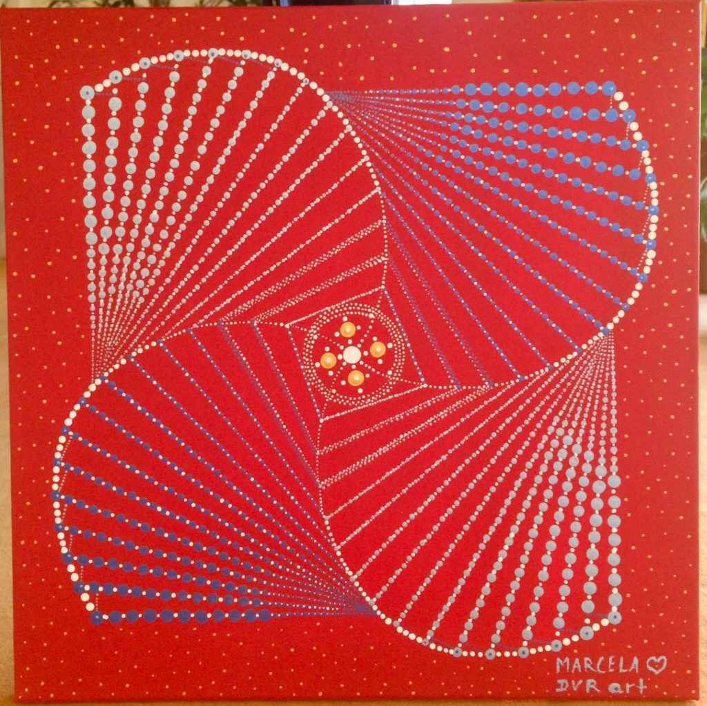 VIII. POSVÁTNÁ GEOMETRIE partnerství a posvátné sexuality. Geometrická dokonalost energetického partnerského propojení, harmonizace a aktivace k ukotvení vibrací a frekvencí na Zemi. Plátno 80x120 akryl, 15. 2. 2019